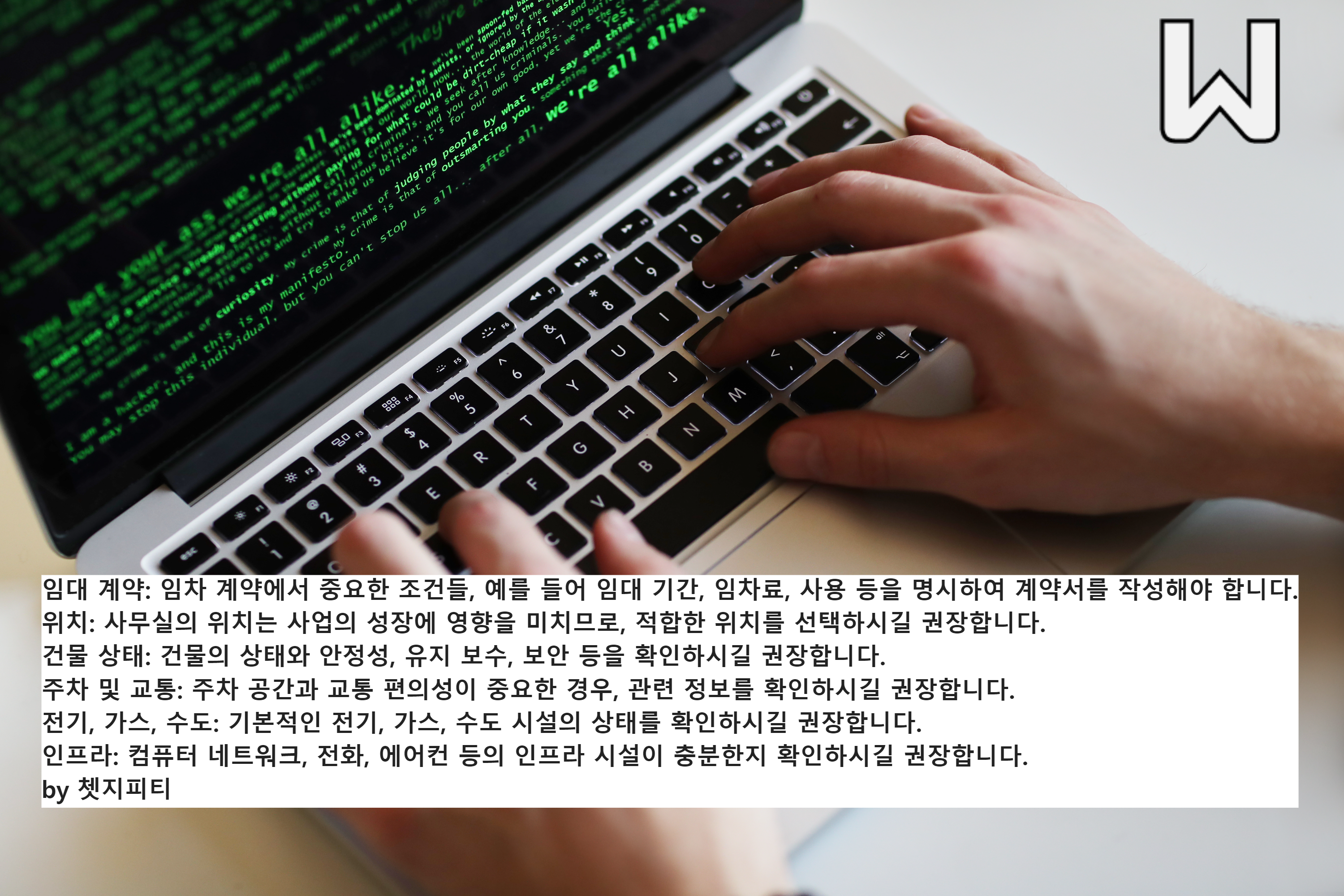 - 위치: 사무실의 위치는 사업의 성장에 영향을 미치므로, 적합한 위치를 선택하시길 권장합니다.
